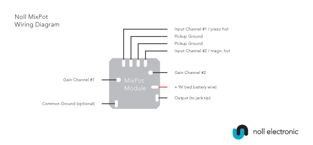 Der MixPot 1.2 ist ein Miniatur Mix-Vorverstärker, welcher an der Unterseite eines Balance Poti (mit Center Click)* montiert ist. Der Vorverstärker ermöglicht es Piezo und magnetischen Pickups, zwei magnetische Tonabnehmer oder zwei Piezo Pickups ohne zusätzliche Schaltungen zu kombinieren. Dabei beträgt die Batterielebensdauer ca. 800 Stunden mit einem 9V Block.