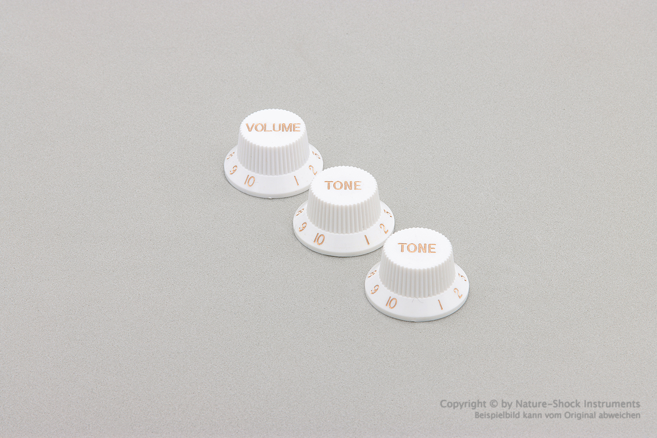 Amtliche Reproduktion der klassischen Potiknöpfe für Strat aus Kunststoff mit Tone Aufdruck und Skala.