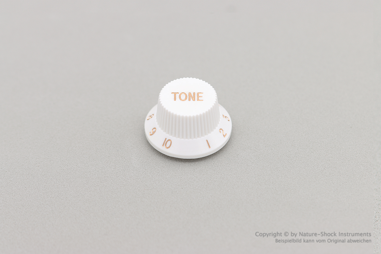 Amtliche Reproduktion der klassischen Potiknöpfe für Strat aus Kunststoff mit Tone Aufdruck und Skala.