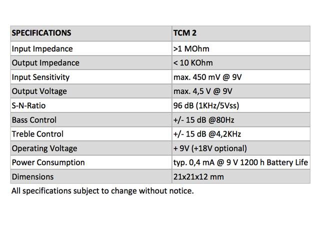 Der integrierte Impedanzwandler des TCM 2 wandelt das hochohmige Pickupsignal um, so das keine kapazitiv bedingten Höhenverluste durch Instrumentenkabel auftreten. Sämtliche Elektroniken werden mit verdrahteten Potis, 9V Batterieclip, sowie einer Klinkenbuchse (mit Masseschalter) geliefert.