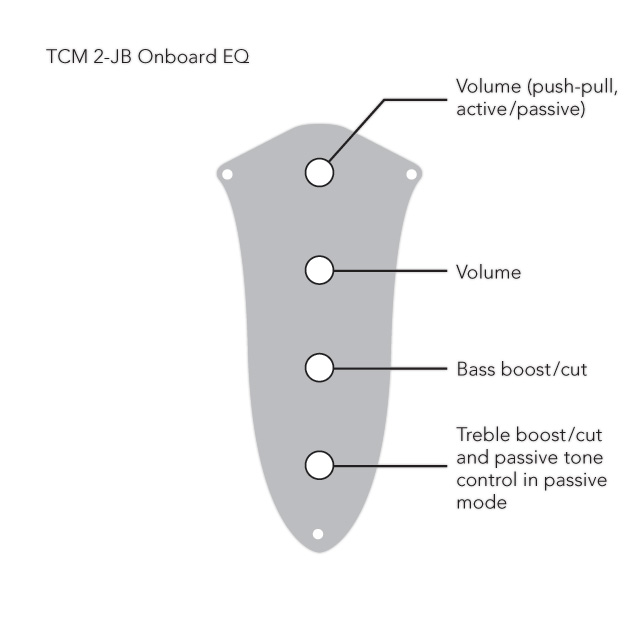 Komplett verdrahtete TCM 2 aktive 2-Band Elektronik mit Buchse auf einer JB-Kontrollplatte montiert, inkl. Metallknöpfe. Der integrierte Impedanzwandler des TCM 2 wandelt das hochohmige Pickupsignal um, so das keine kapazitiv bedingten Höhenverluste durch Instrumentenkabel auftreten.
