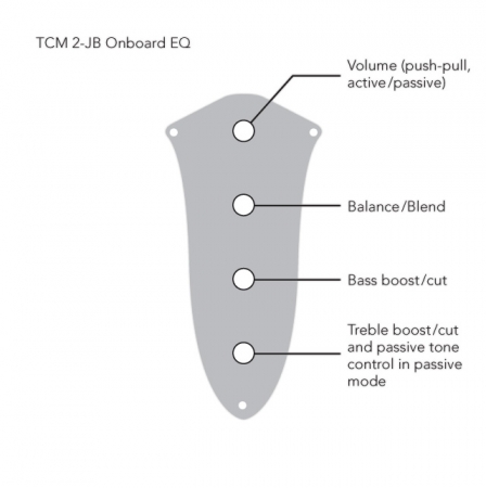 Komplett verdrahtete TCM 2 aktive 2-Band Elektronik mit Buchse auf einer JB-Kontrollplatte montiert, inkl. Metallknöpfe. Der integrierte Impedanzwandler des TCM 2 wandelt das hochohmige Pickupsignal um, so das keine kapazitiv bedingten Höhenverluste durch Instrumentenkabel auftreten.