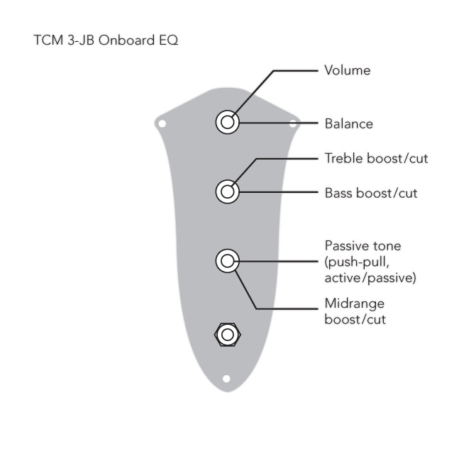 Komplett verdrahtete TCM 3 aktive 3-Band Elektronik mit Buchse auf einer JB-Kontrollplatte montiert, inkl. Metallknöpfe. Der integrierte Impedanzwandler des TCM 3 wandelt das hochohmige Pickupsignal um, so das keine kapazitiv bedingten Höhenverluste durch Instrumentenkabel auftreten.