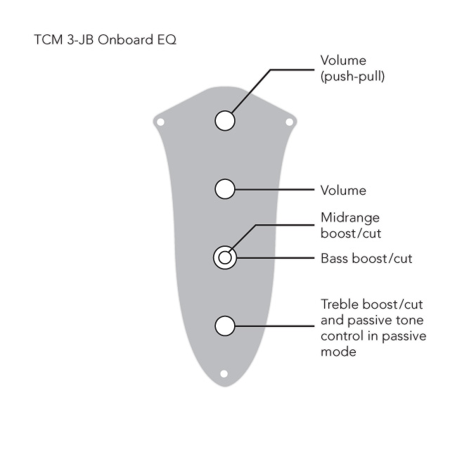 Komplett verdrahtete TCM 3 aktive 3-Band Elektronik mit Buchse auf einer JB-Kontrollplatte montiert, inkl. Metallknöpfe. Der integrierte Impedanzwandler des TCM 3 wandelt das hochohmige Pickupsignal um, so das keine kapazitiv bedingten Höhenverluste durch Instrumentenkabel auftreten.