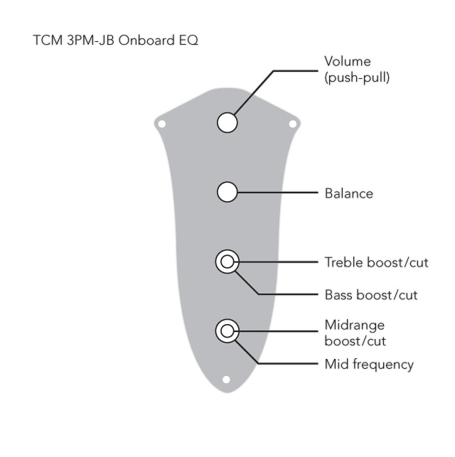 Komplett verdrahtete TCM 3 aktive 3-Band Elektronik mit Buchse auf einer JB-Kontrollplatte montiert, inkl. Metallknöpfe. Als besonderes Leistungsmerkmal besitzt das TCM 3PM eine konzentrische Mittenregelung mit einem wählbaren Frequenzbereich zwischen 280Hz und 1,5KHz.