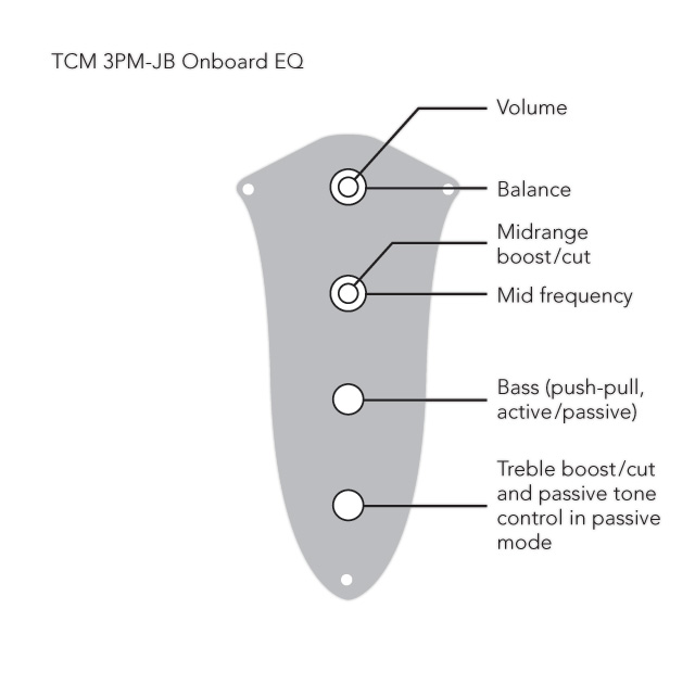 Komplett verdrahtete TCM 3 aktive 3-Band Elektronik mit Buchse auf einer JB-Kontrollplatte montiert, inkl. Metallknöpfe. Als besonderes Leistungsmerkmal besitzt das TCM 3PM eine konzentrische Mittenregelung mit einem wählbaren Frequenzbereich zwischen 280Hz und 1,5KHz.