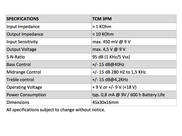 Als besonderes Leistungsmerkmal besitzt das TCM 3PM eine konzentrische Mittenregelung mit einem wählbaren Frequenzbereich zwischen 280Hz und 1,5KHz. Sämtliche Elektroniken werden mit verdrahteten Potis, 9V Batterieclip, sowie einer 9-poligen Klinkenbuchse (mit 2 Masseschaltern) geliefert. Die 9-polige Buchse eignet sich nur für den Fronteinbau im Korpus, oder seitlich mit Hilfe eines Buchsenblechs!